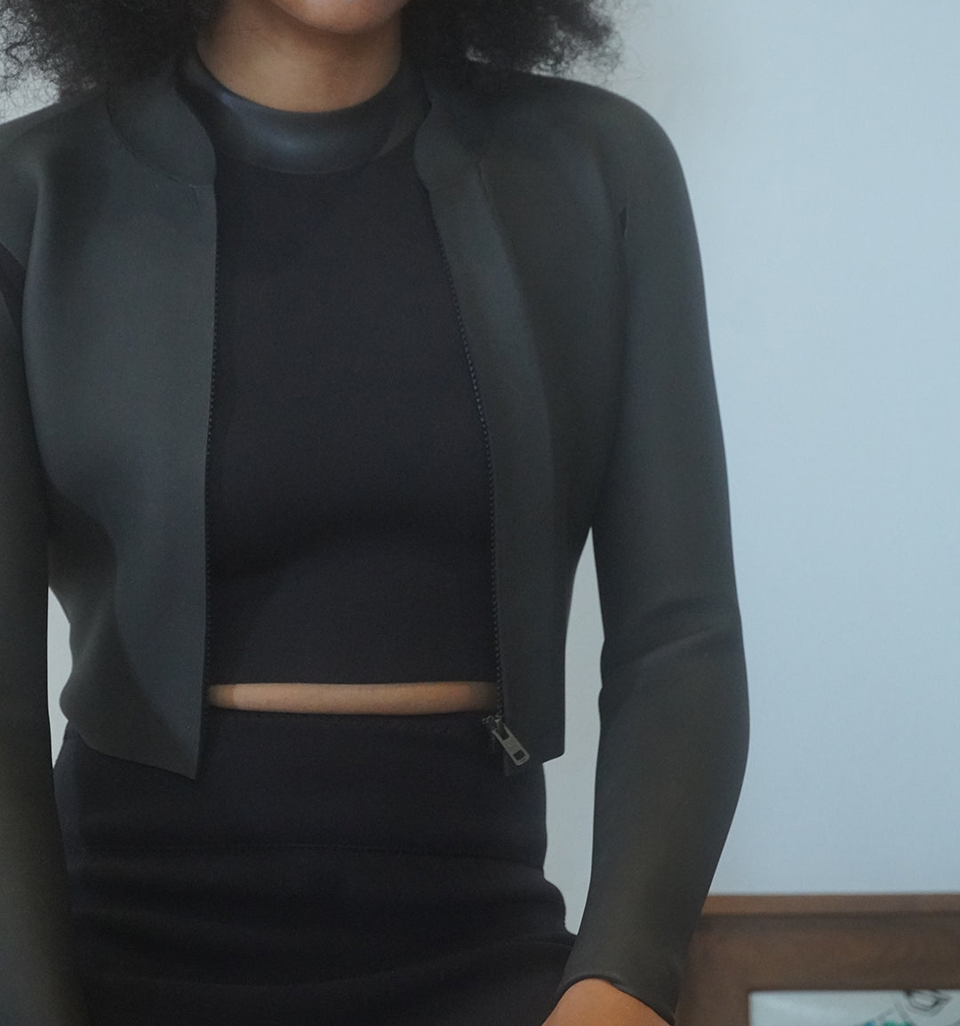 自由に動けて美しく魅せるショートジップジャケット。肌に密着する2mmメッシュラバー素材を使用しており、保温性を確保しつつ通気性も抜群。軽やかで動きやすく、腰まわりがもたつかないショート丈は、ハイウエストのVALETTAボトムスとの相性抜群。肌寒い季節に最適で、春先や秋口まで幅広くご使用いただけます。