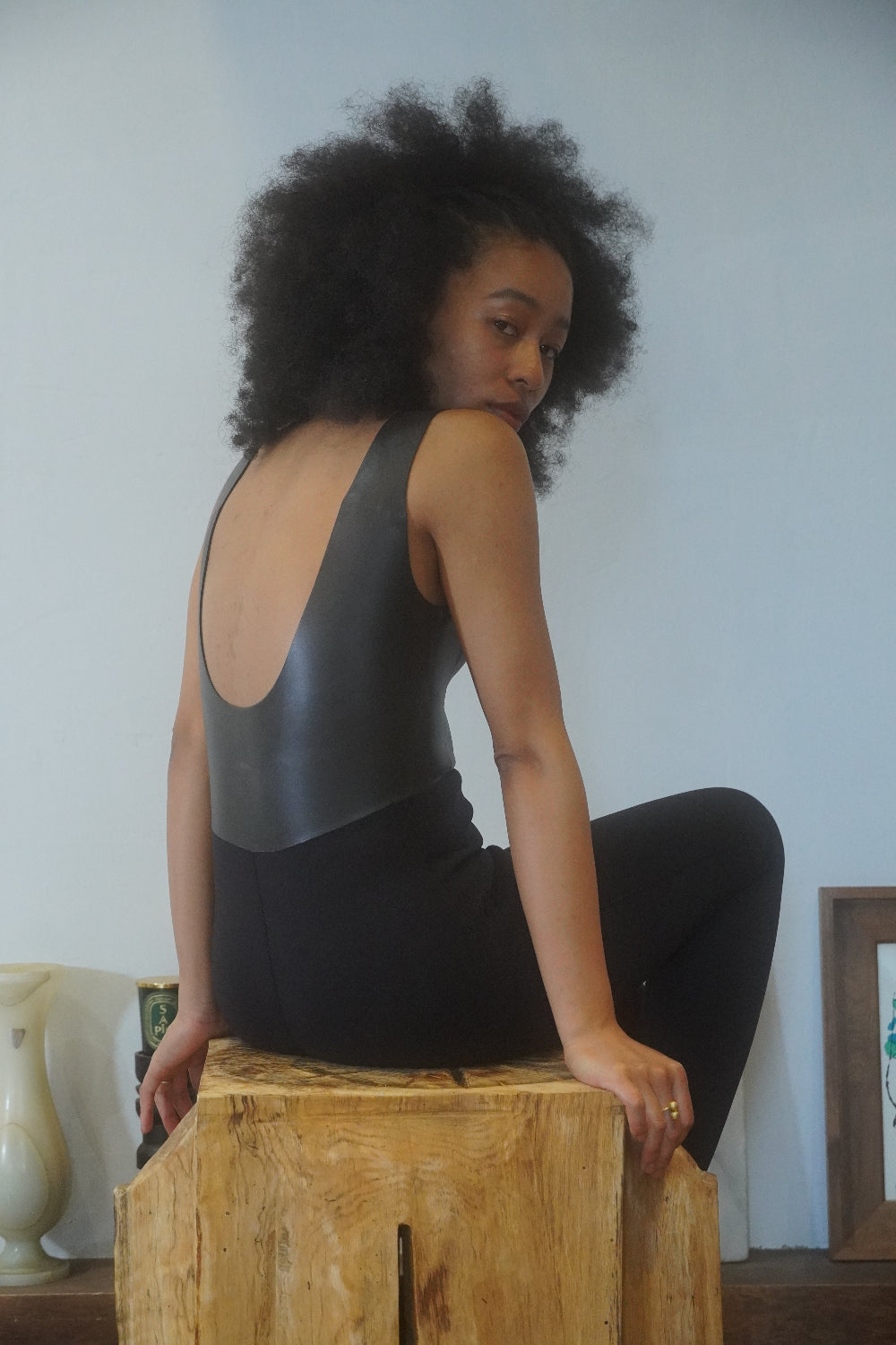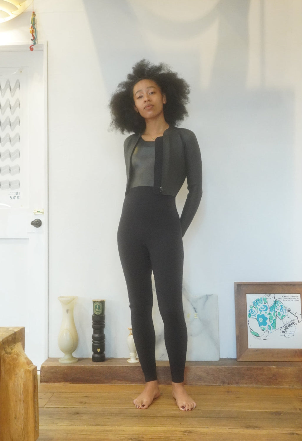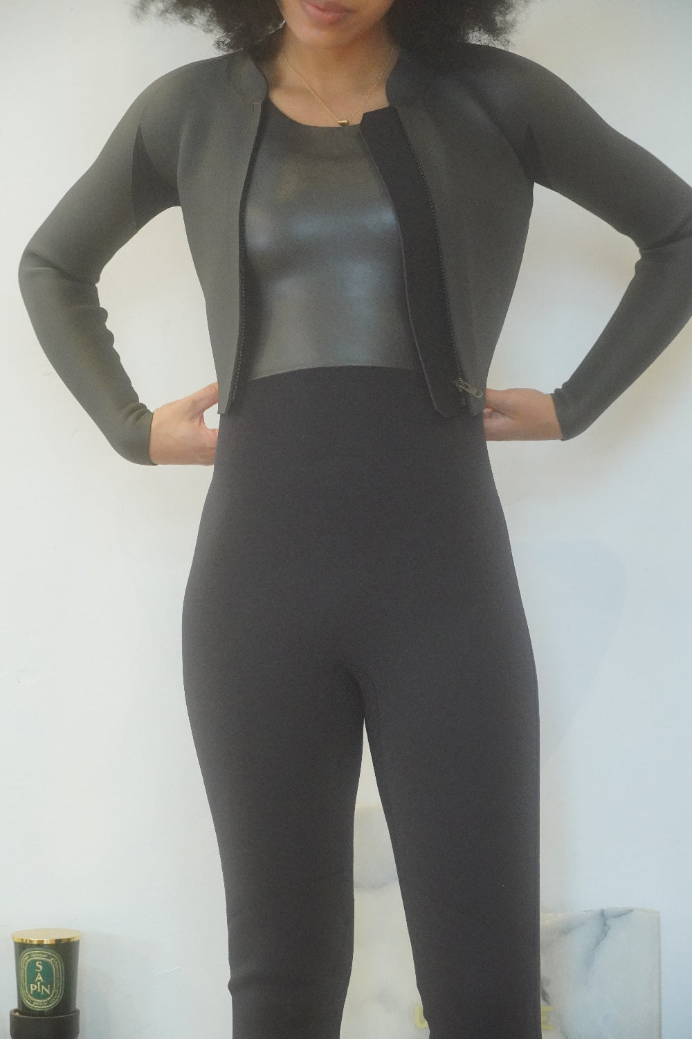 バストカップ付きでインナーいらず。1枚で快適に着用できるロングジョン。TOPSは縫製を省いた切りっぱなしのフラット仕様で、まるで肌の一部のようにフィットするしなやかな着心地。Rubber Short Zip Jacketとの組み合わせで、肌寒い季節もお使いいただけます。