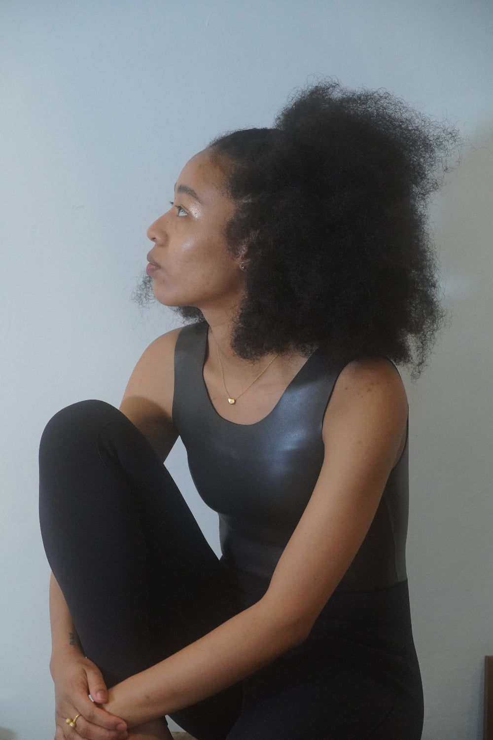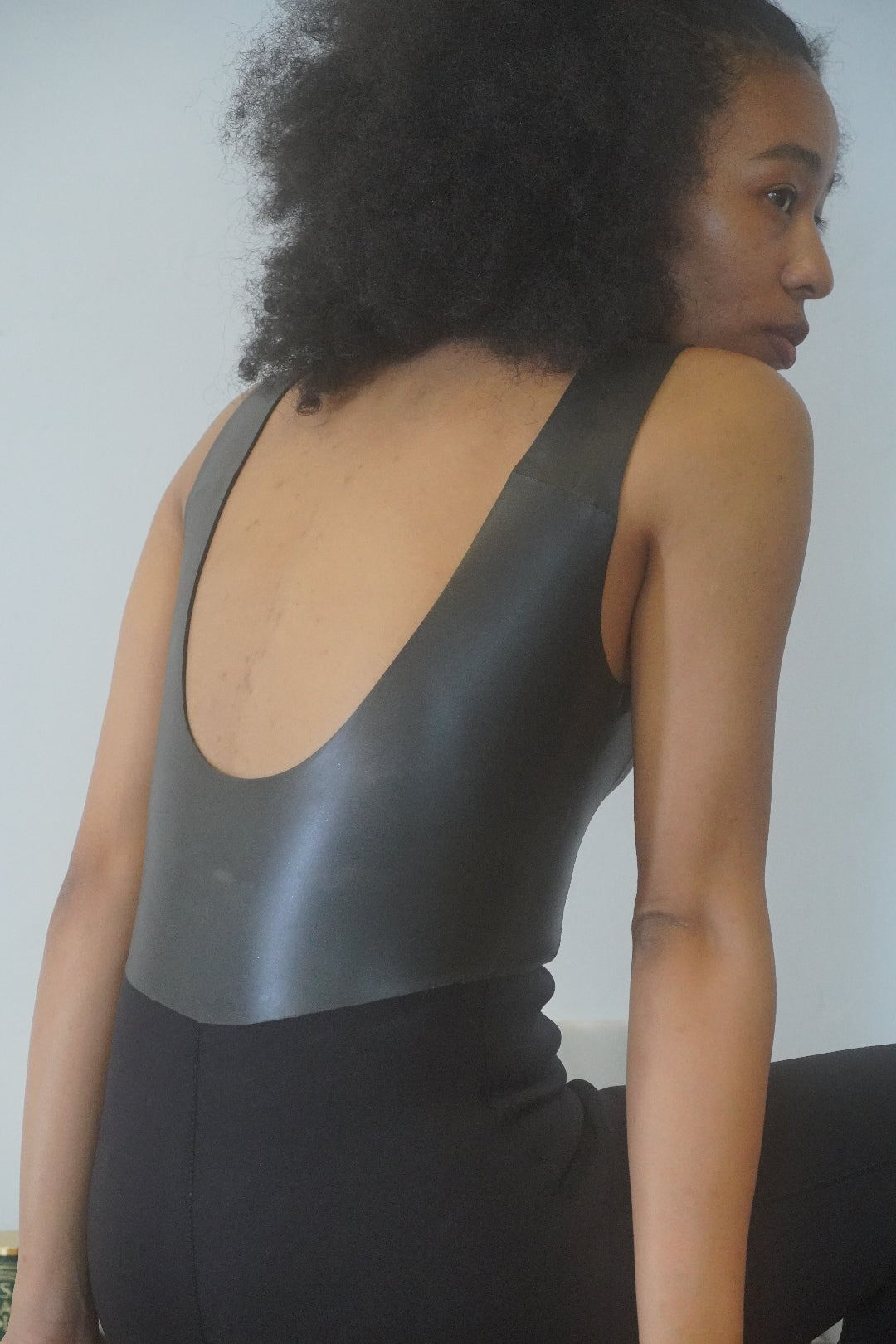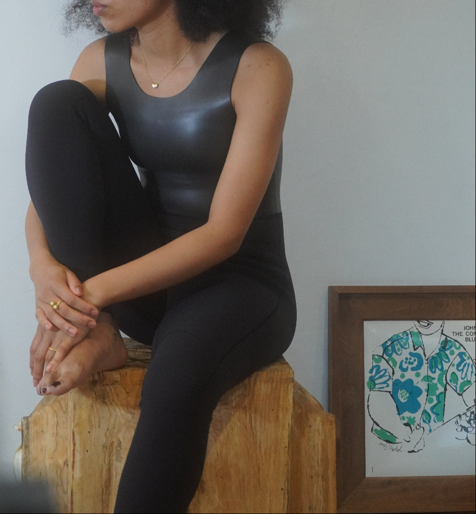 バストカップ付きでインナーいらず。1枚で快適に着用できるロングジョン。TOPSは縫製を省いた切りっぱなしのフラット仕様で、まるで肌の一部のようにフィットするしなやかな着心地。Rubber Short Zip Jacketとの組み合わせで、肌寒い季節もお使いいただけます。